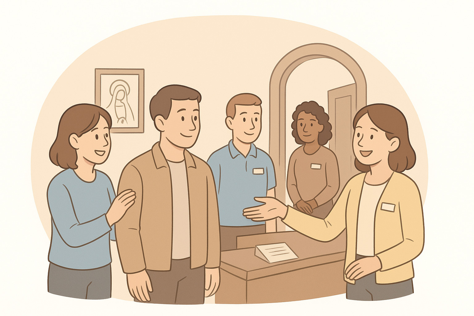 Recepciona os fiéis na entrada da igreja, oferecendo informações e promovendo um ambiente acolhedor.
