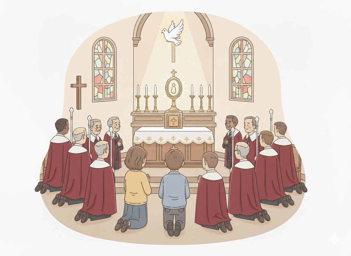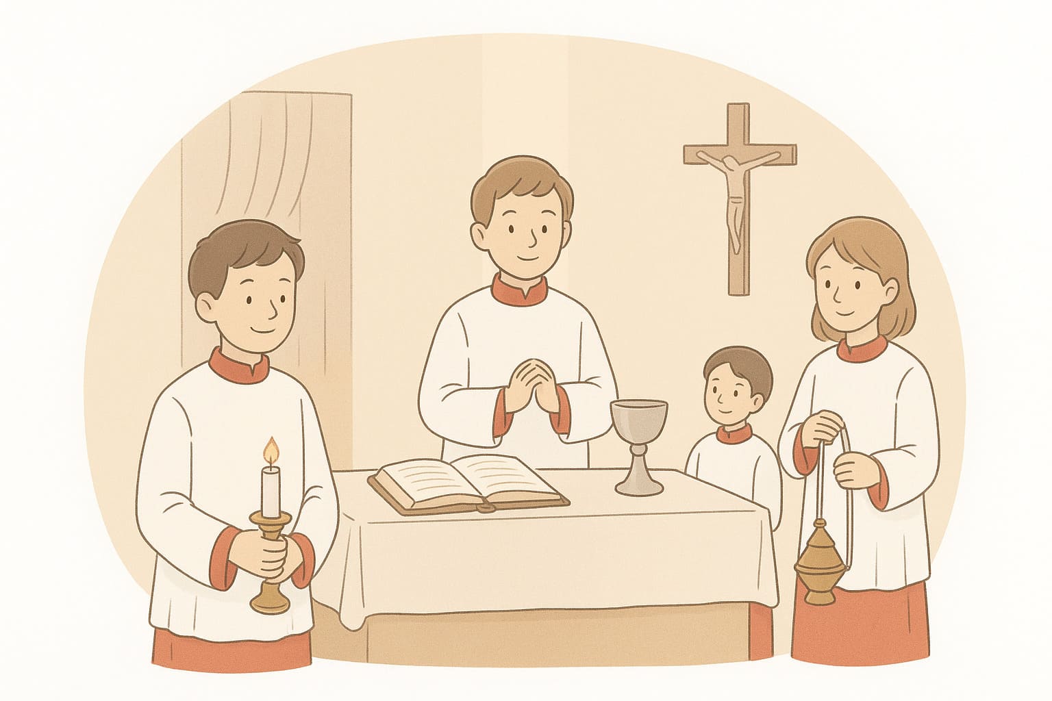 Grupo de crianças e jovens que servem ao altar durante as celebrações litúrgicas, auxiliando o sacerdote.