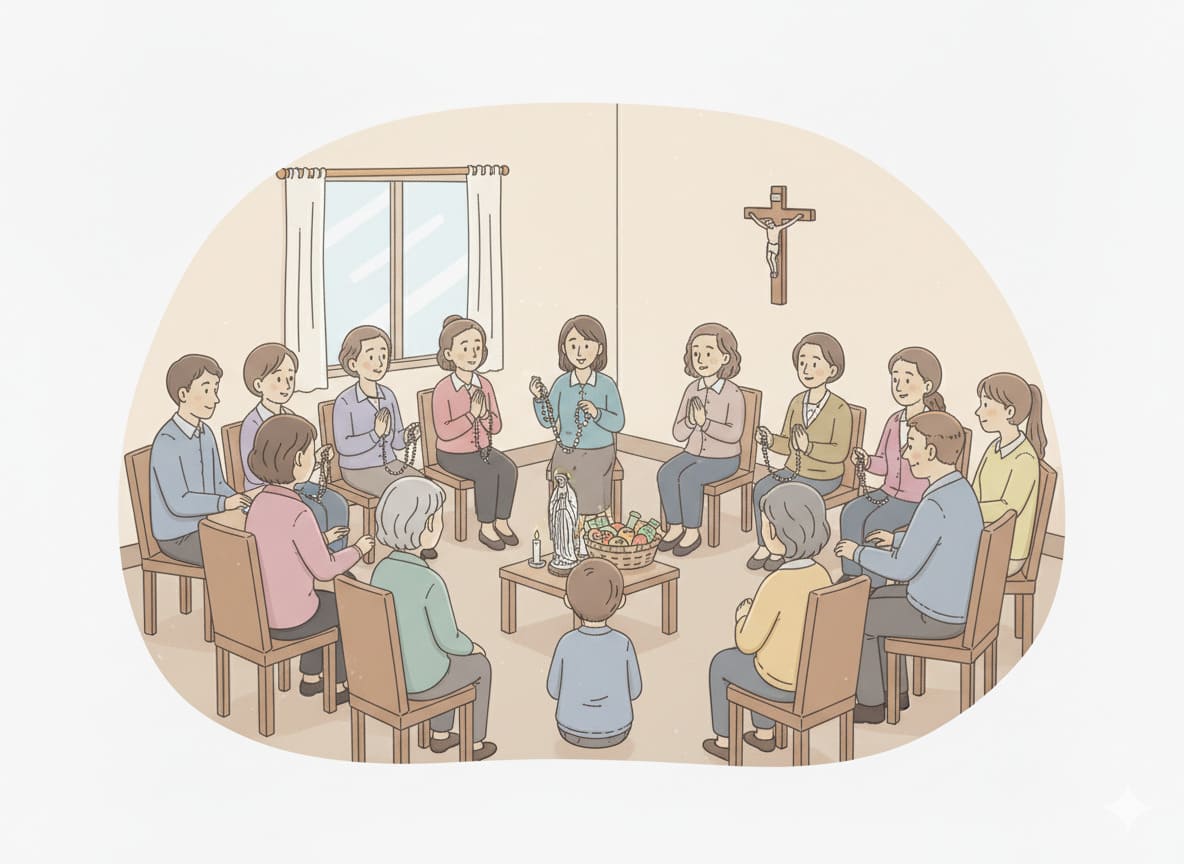 Reúne mulheres da comunidade para a oração do Santo Terço, partilhando a fé e as intenções.